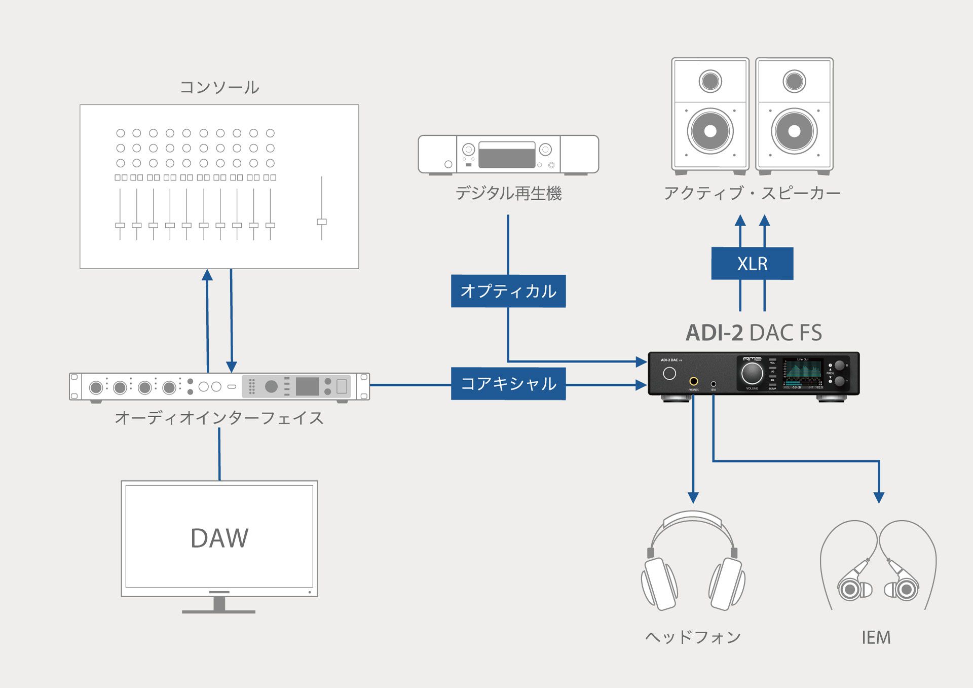 DAW、オーディオ・インターフェイス、スピーカーなどの標準的なホームスタジオにADI-2 DAC FSをマスターDAコンバーターとして追加することにより、メイン・モニター環境をリファレンス・クラスの高解像度、透明無垢な音質、超低ノイズ&歪み率なサウンドで、的確なミックス作業が行える環境を提供するだけでなく、部屋の特性に合わせた左右個別のEQや、近年最も重要視されるヘッドフォン、及びインイヤーモニーターでの適切なインピーダンスでの出力を提供します。